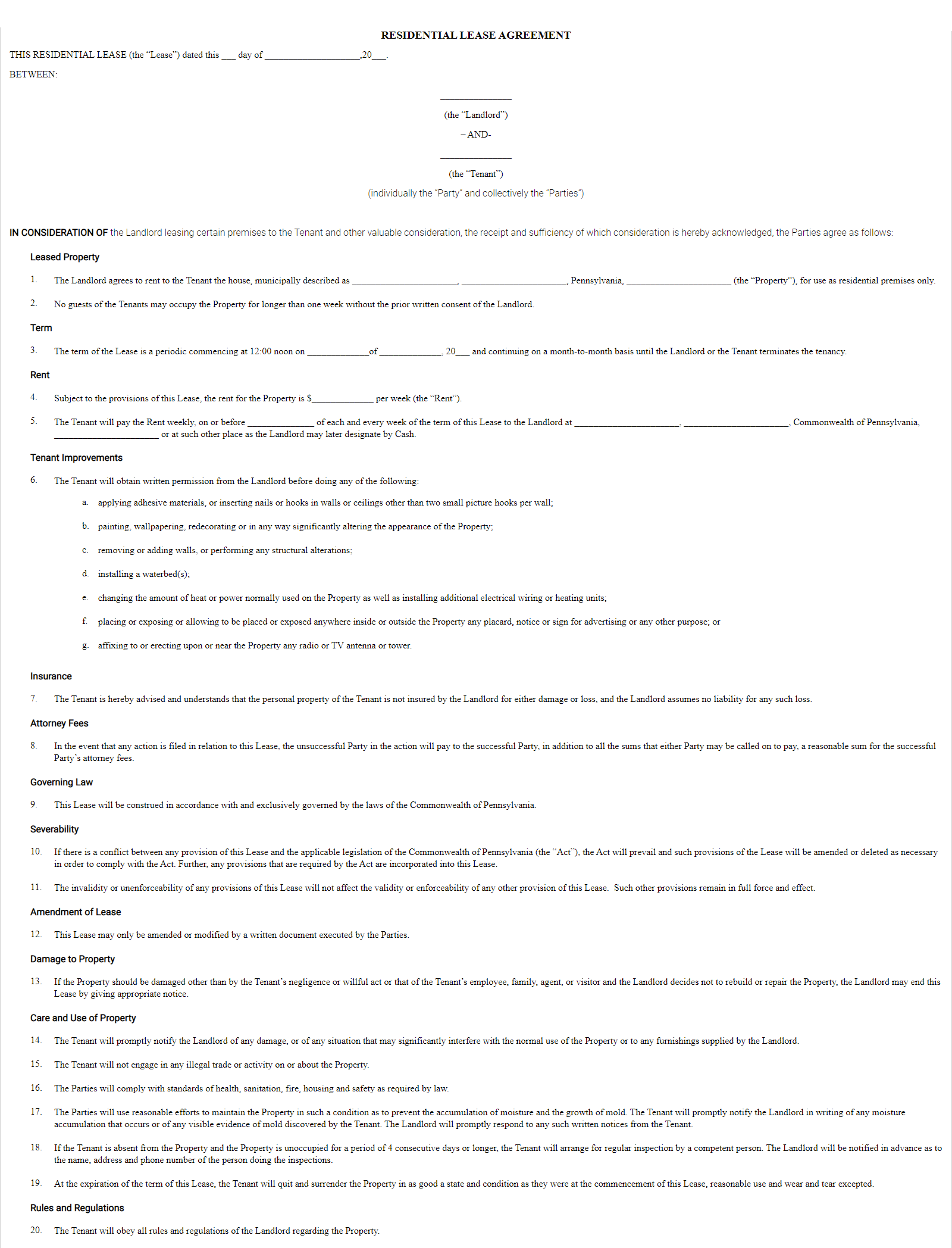Free Pennsylvania Standard Residential Lease Agreement Template