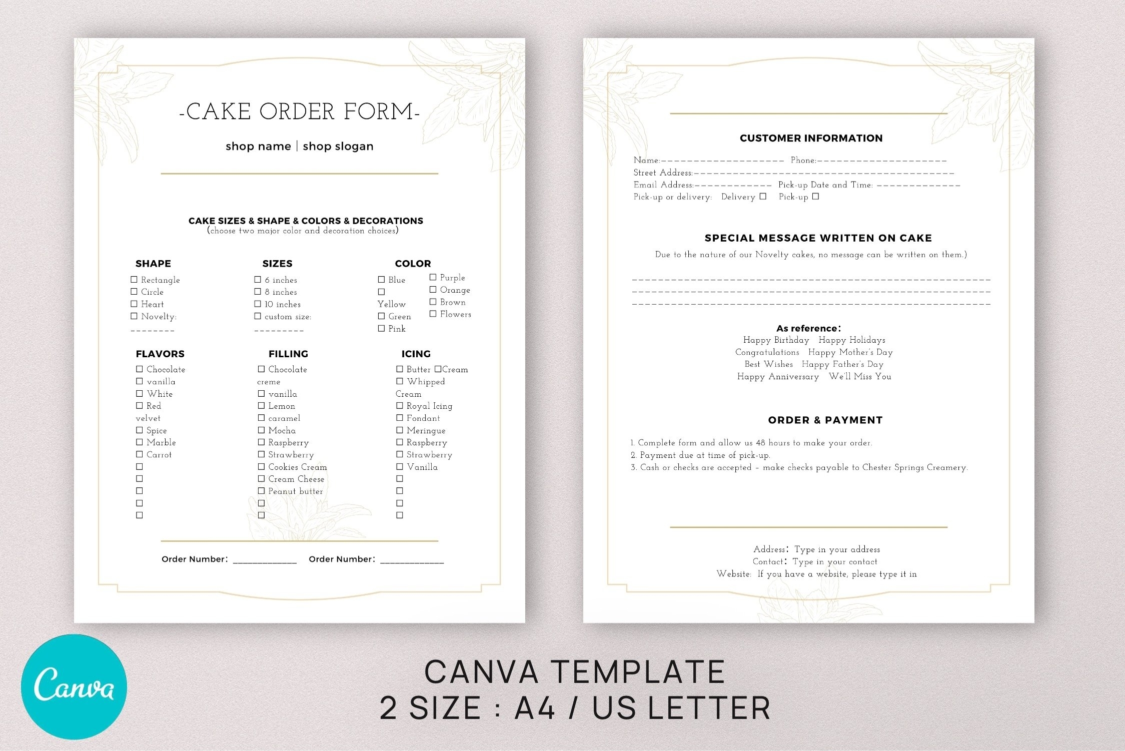 Editable Cake Order Form Canva Template Bu0026W 1