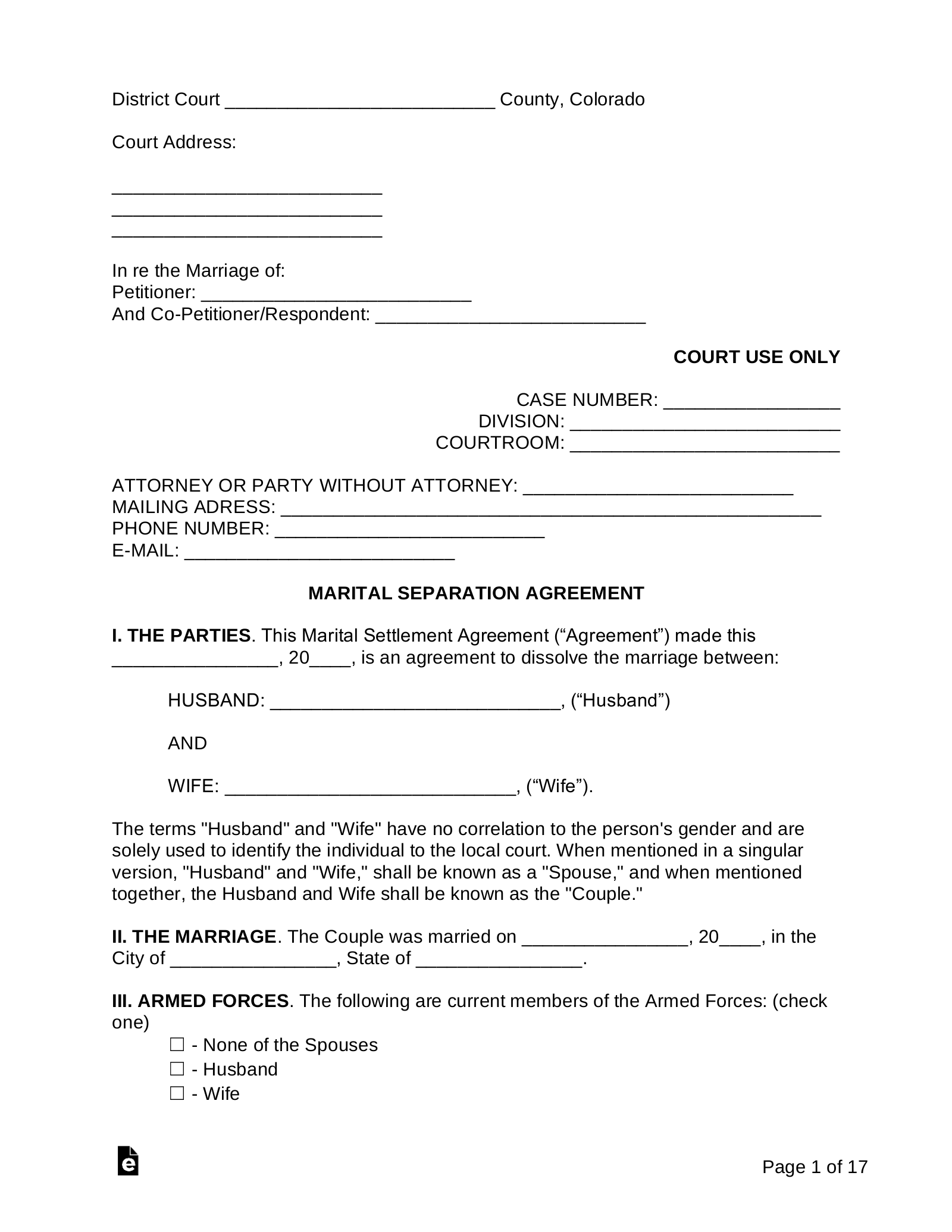 Free Colorado Marital Settlement Divorce Agreement PDF Word