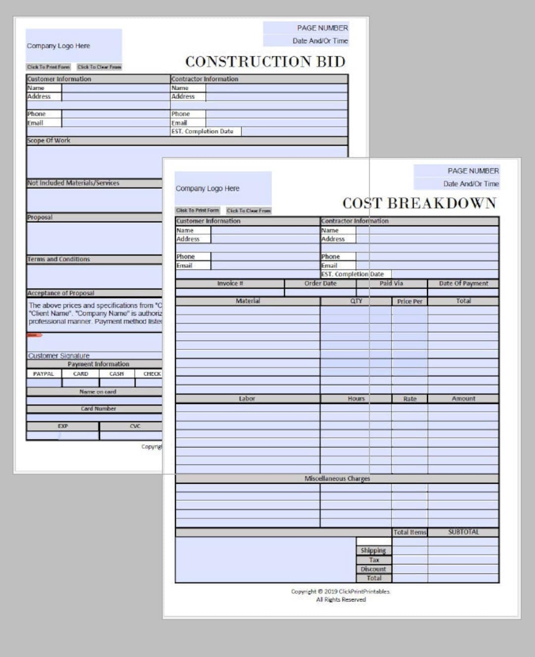 Construction Bid Project Form With Cost Breakdown Template Editable Downloadable Printable Small Business Fill In PDF black And White Etsy