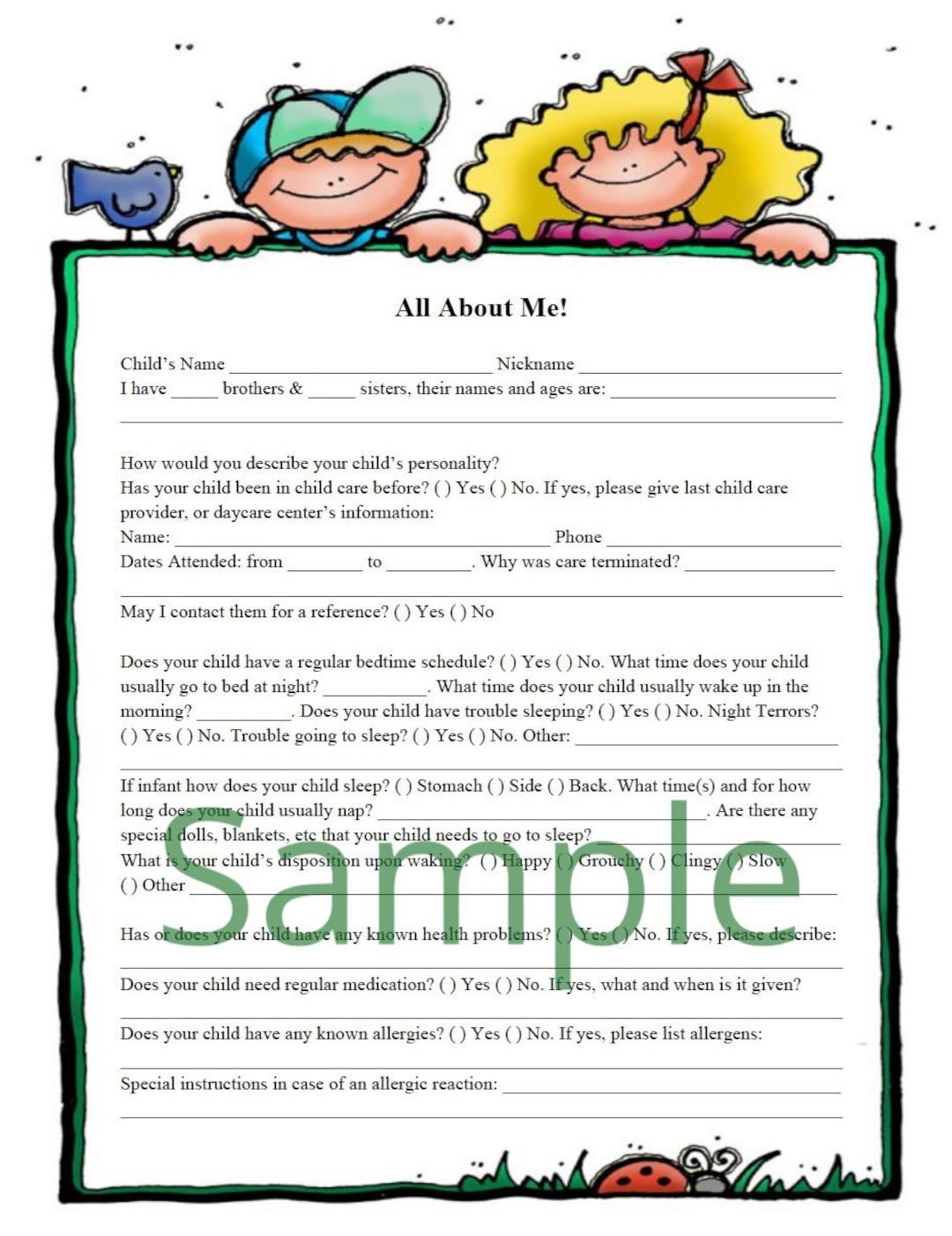All About Me Daycare Questionnaire Fully Editable Child Care Form PDF MS Word Text File U0026 Template Png Download Save Print Today Etsy