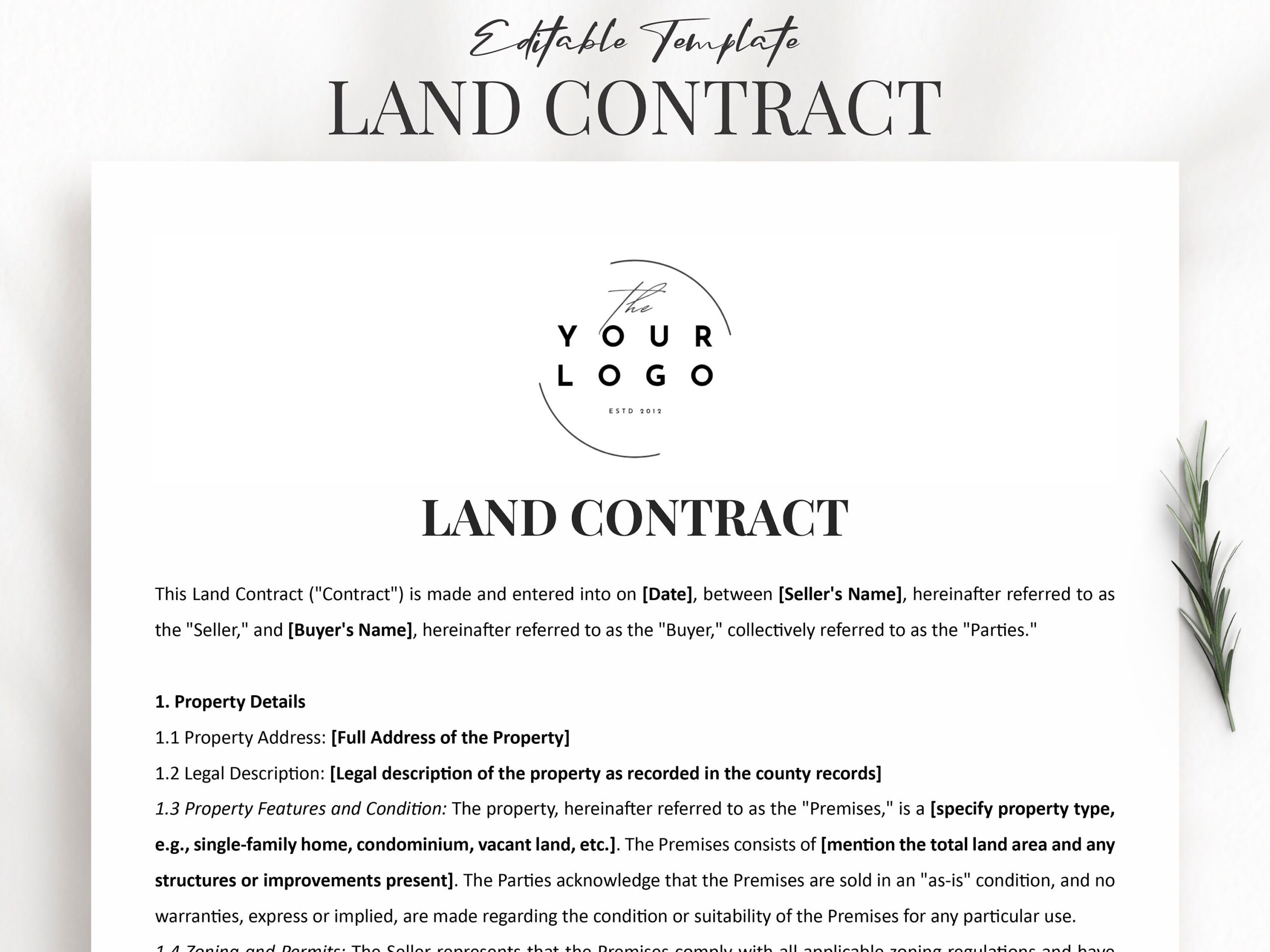 Editable Land Contract Template Land Agreement Form Word U0026 PDF Document Customizable For Smooth Property Transactions Etsy
