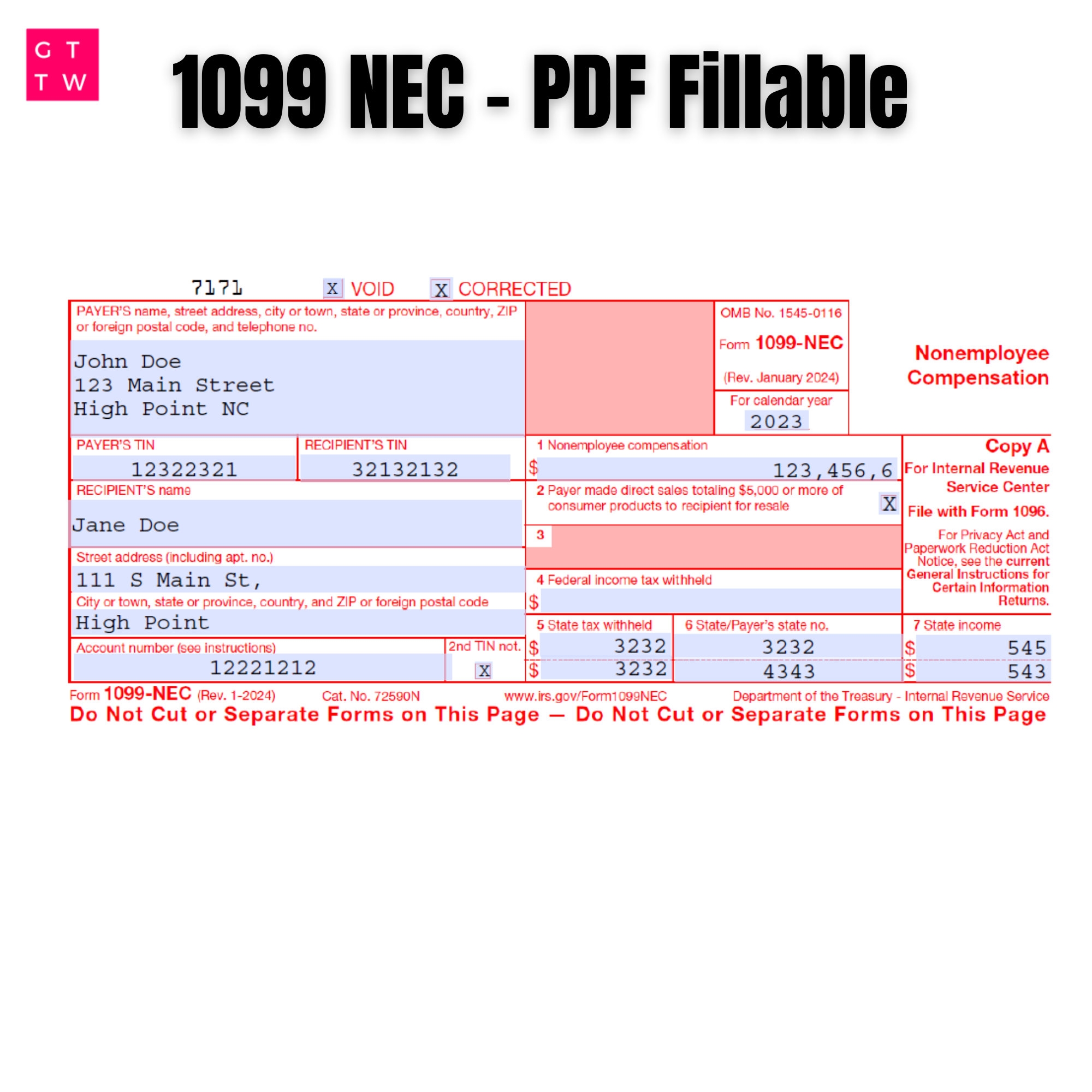 1099 NEC Editable PDF Fillable Template 2024 With Print And