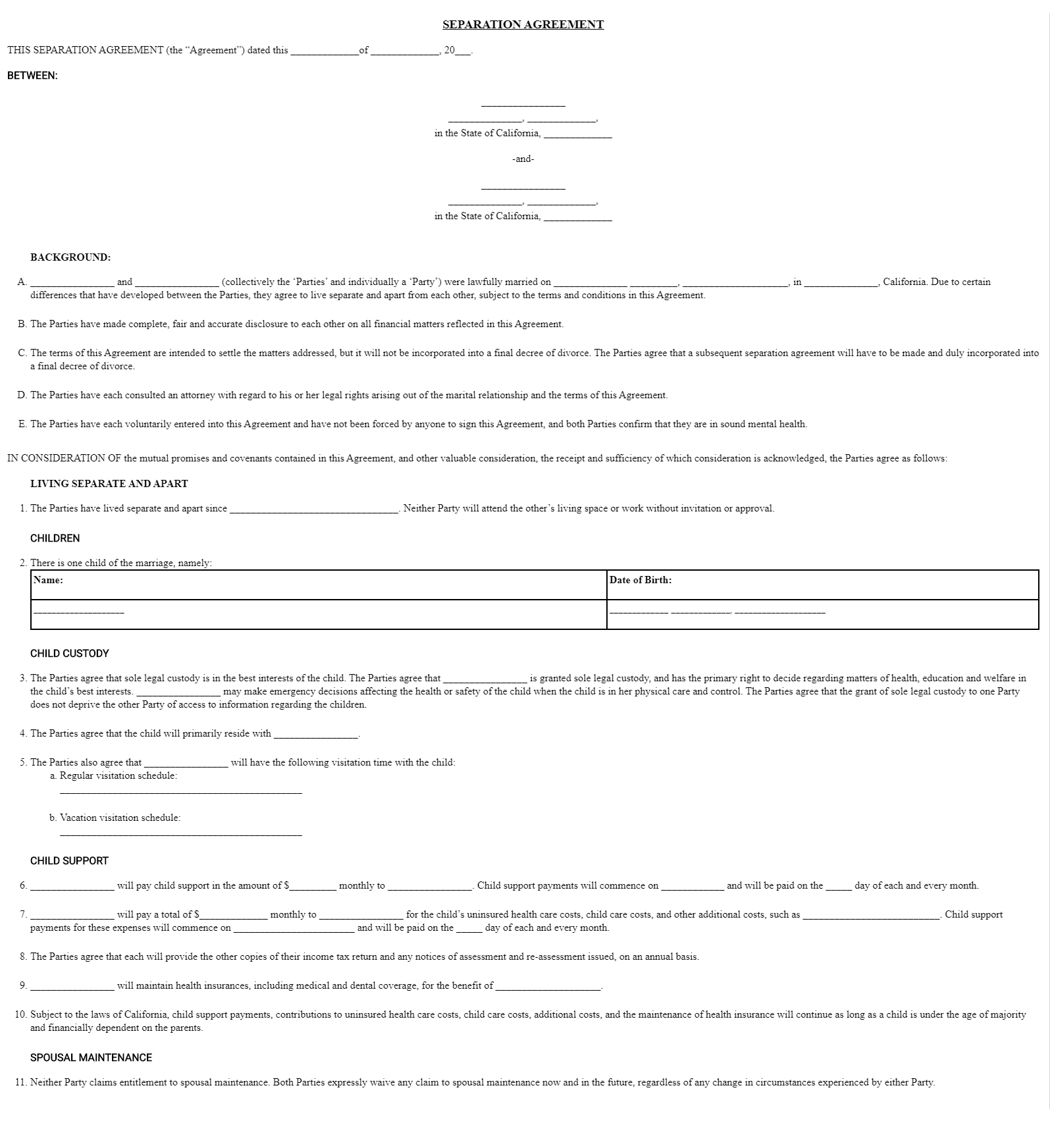 Free California Marital Separation Agreement Legal Separation Forms CA