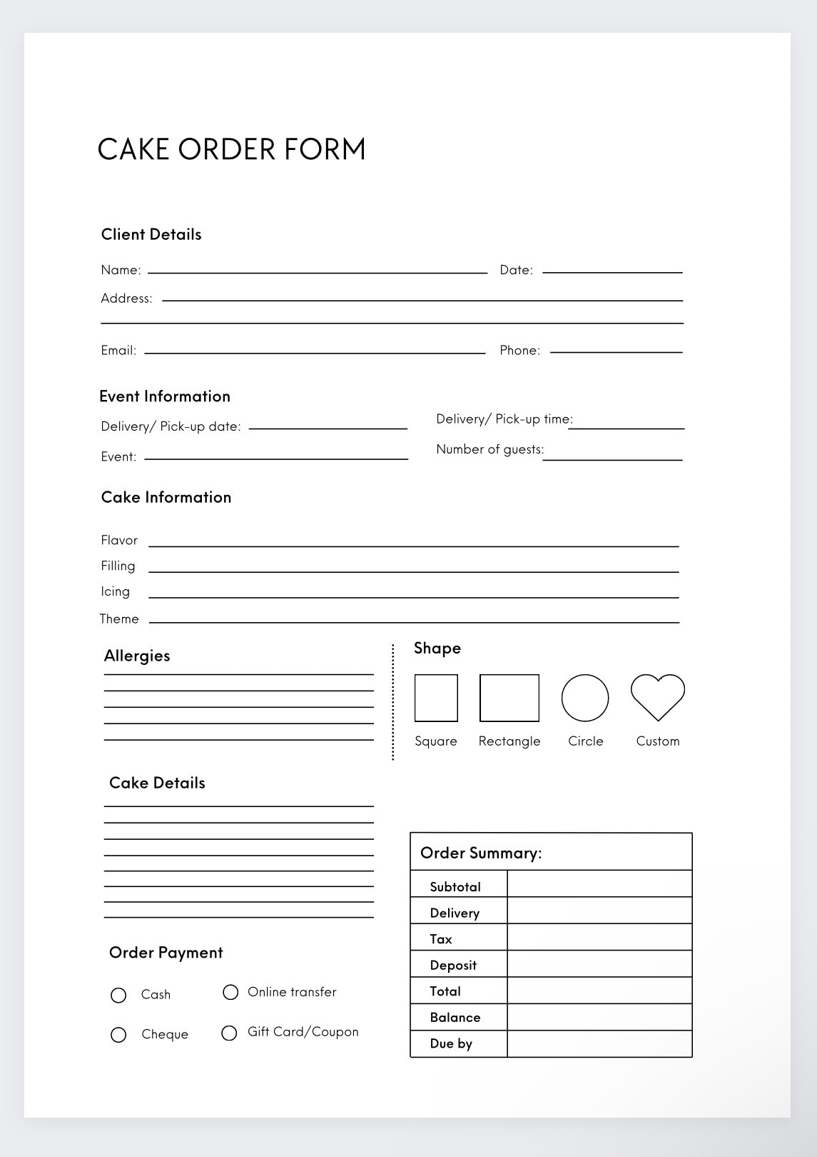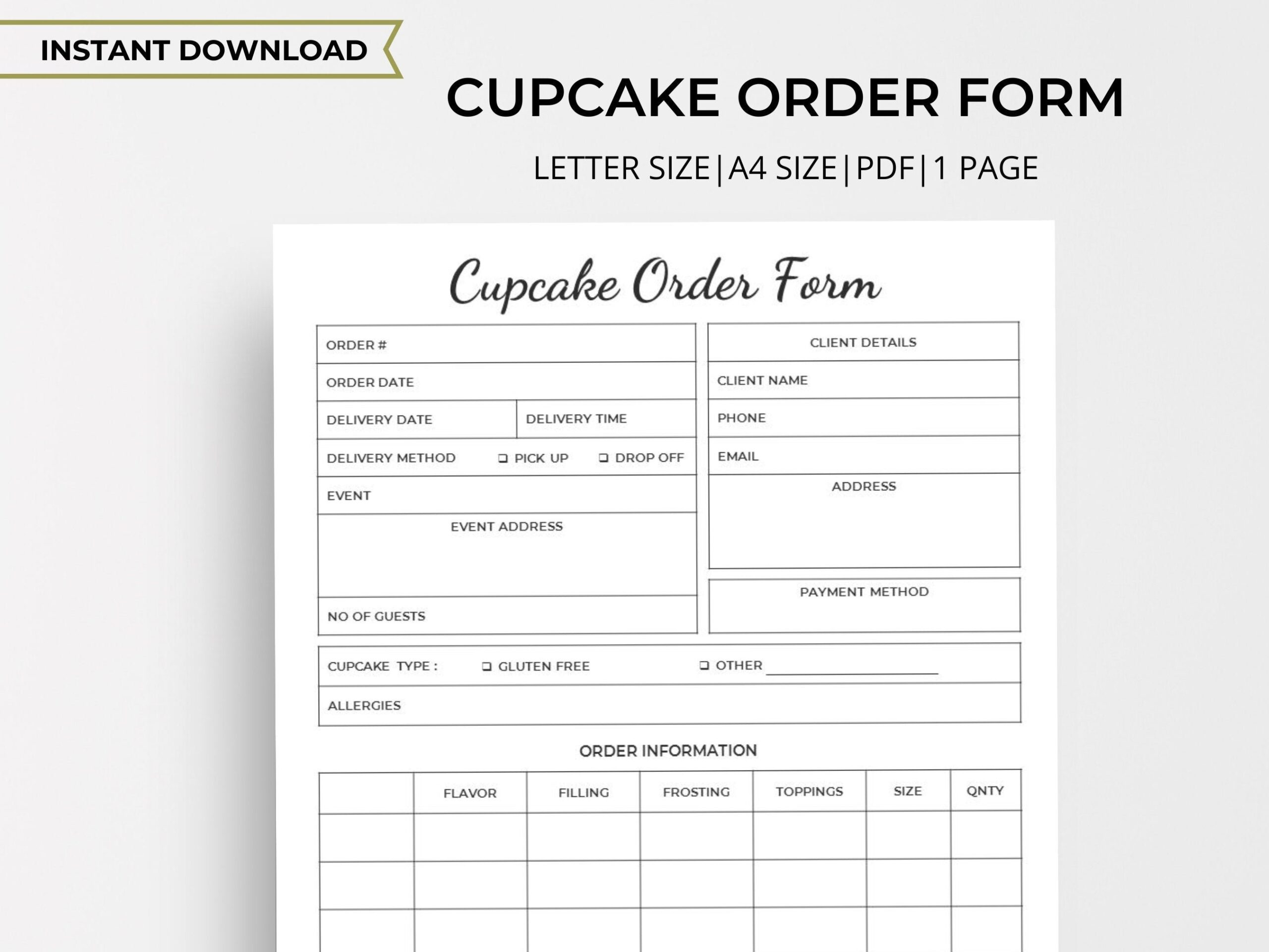 Our order forms include space for flavor, frosting, decorations, quantity, and any special requests. You can even add your contact information and event details to make sure everything is perfect.
