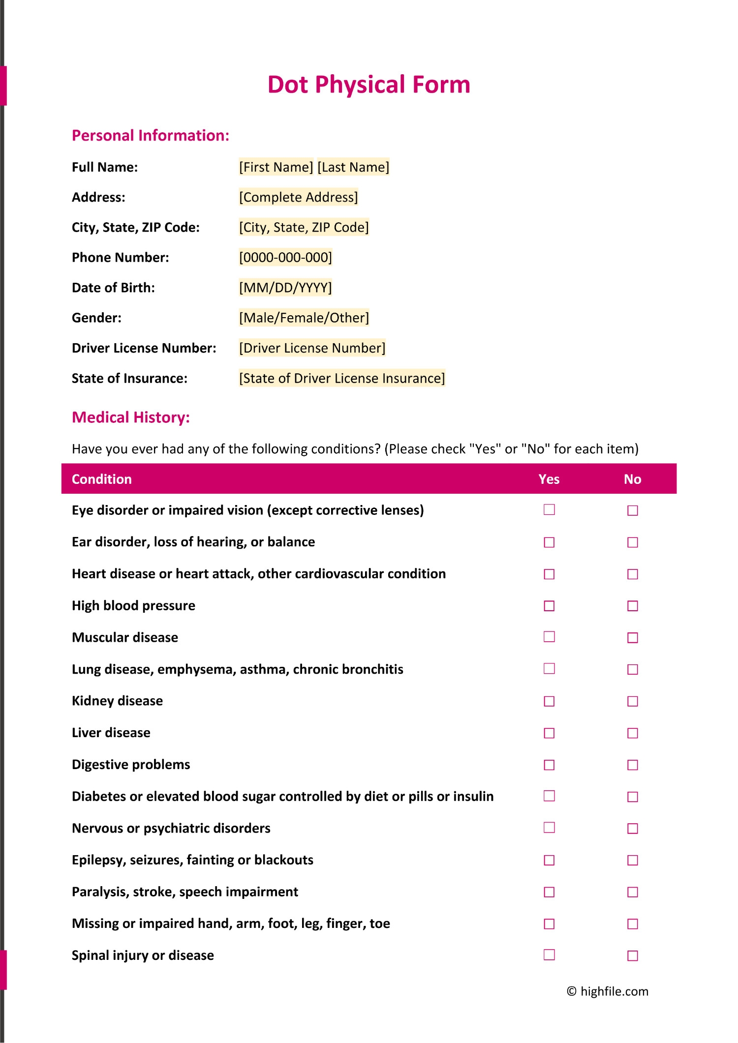 Don’t wait until the last minute to find a dot physical form. Take advantage of the convenience of a free printable version and have peace of mind knowing that you’re prepared for your upcoming physical. Download your form today and check this task off your to-do list!