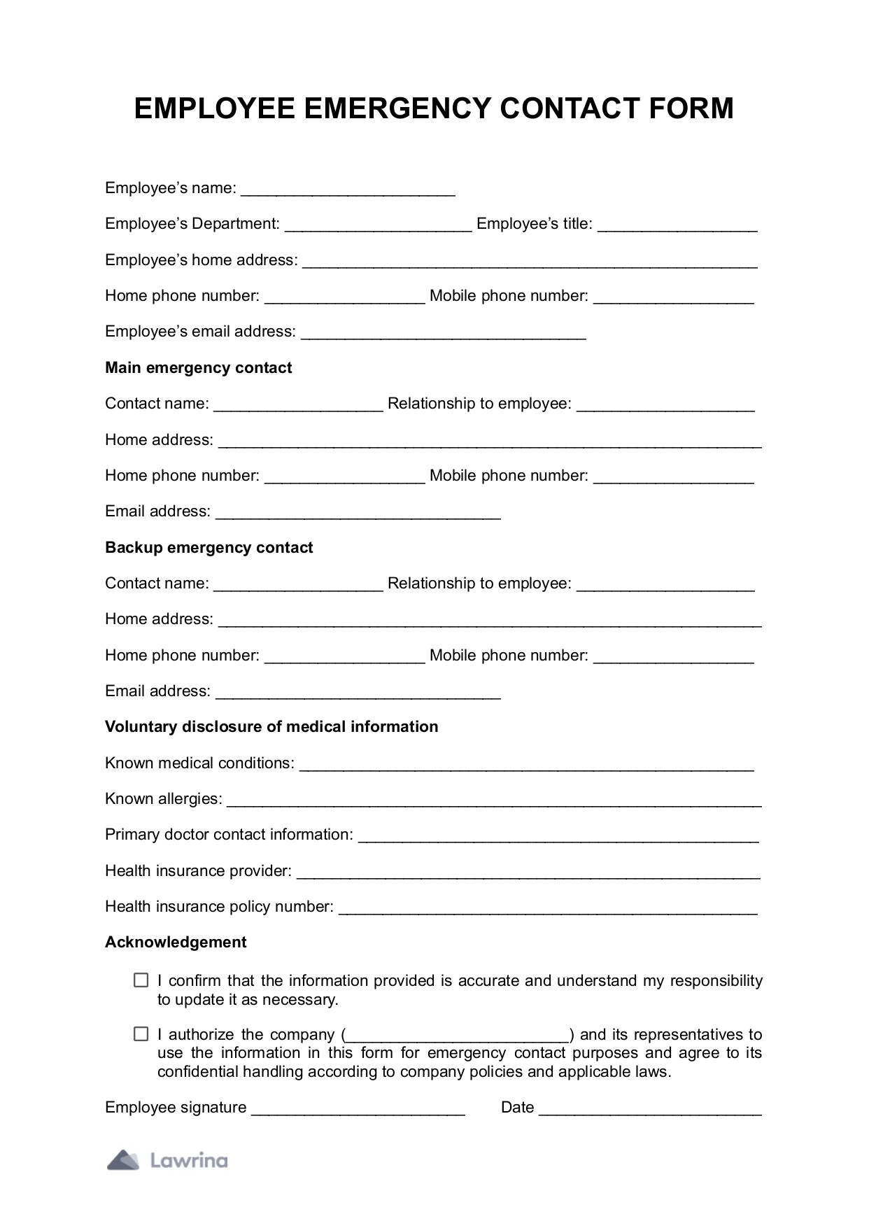 Employee Emergency Contact Form Template PDF Lawrina
