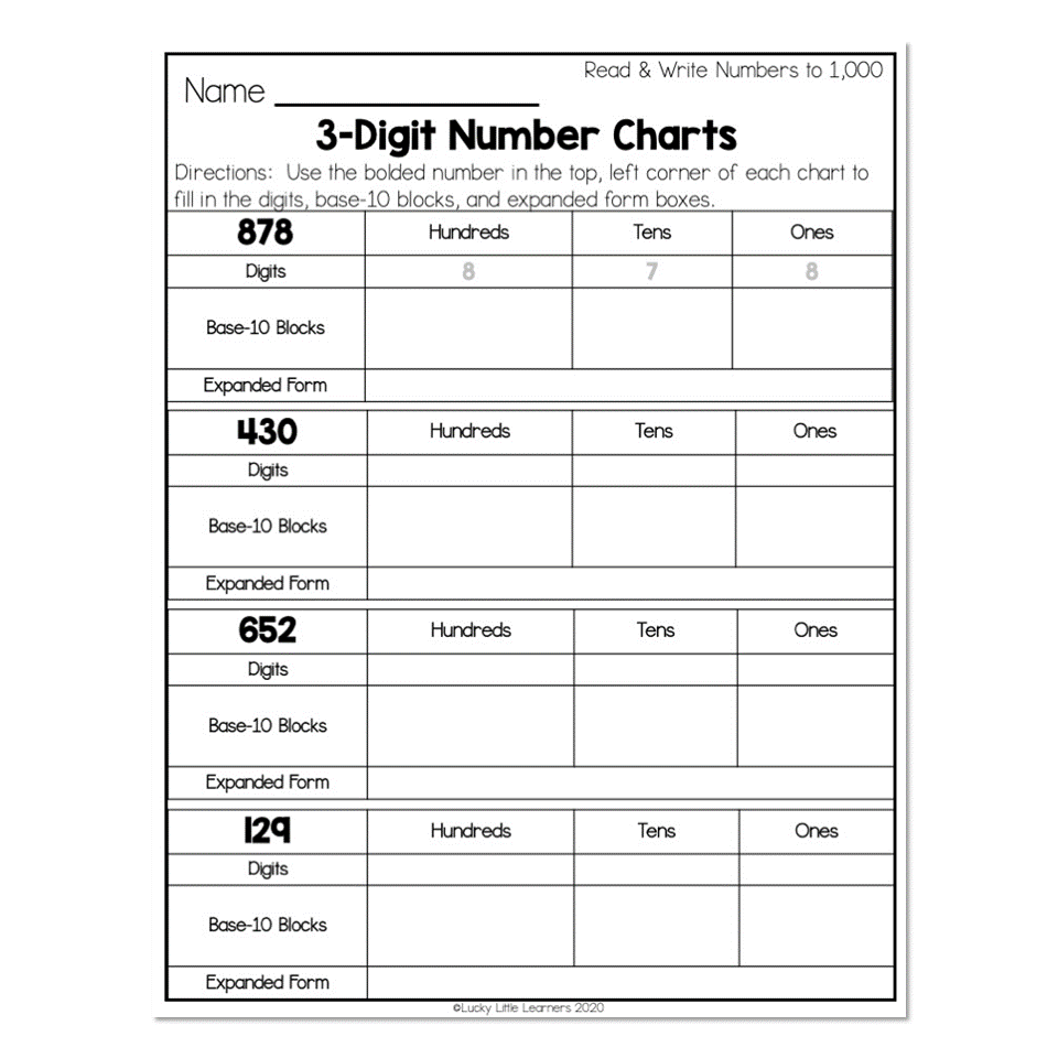 2nd Grade Math Worksheets Place Value Read U0026 Write Numbers To 1 000 3 Digit Number Chart Lucky Little Learners