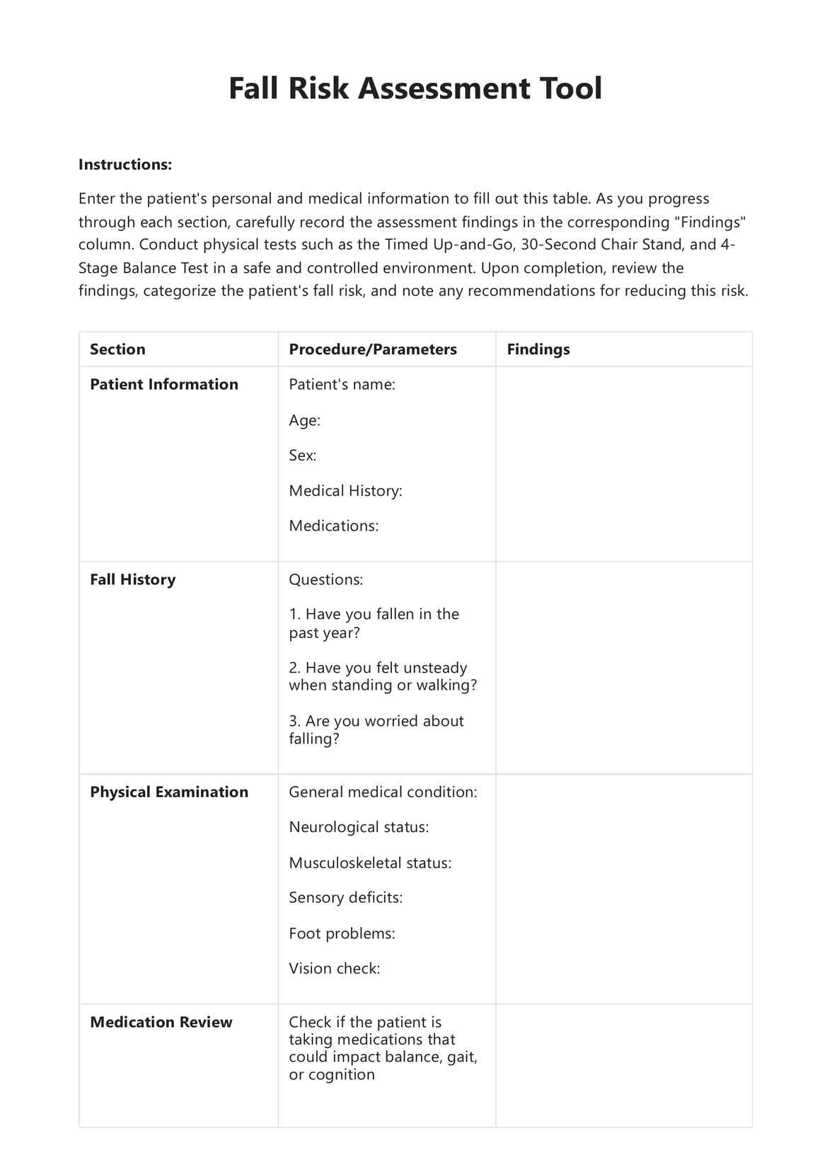 By assessing factors such as balance, mobility, medications, and home environment, these forms provide valuable insights into an individual’s fall risk. They can be used by healthcare professionals, caregivers, or individuals themselves to take proactive steps in preventing falls.