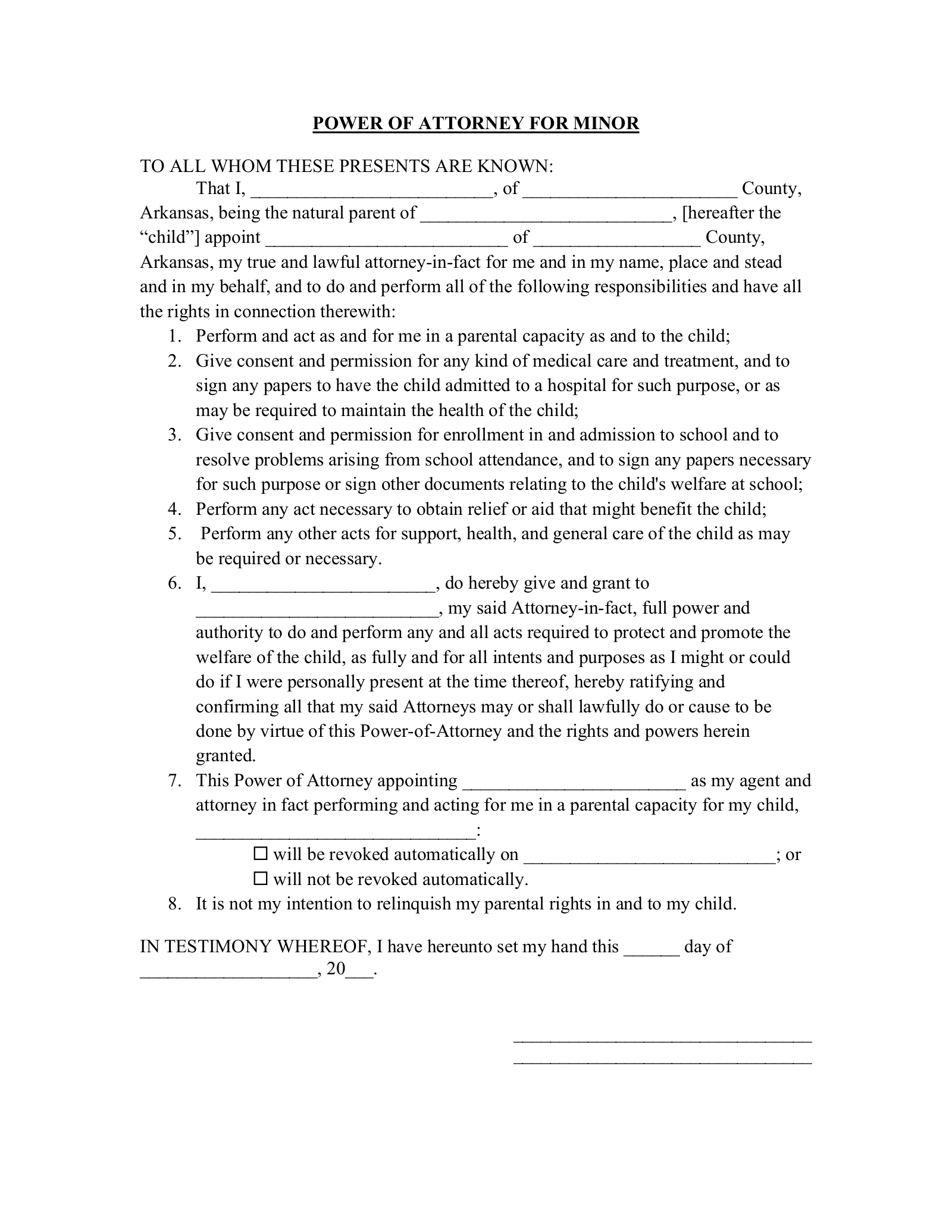 Free Arkansas Minor Child Power Of Attorney Form PDF Word EForms