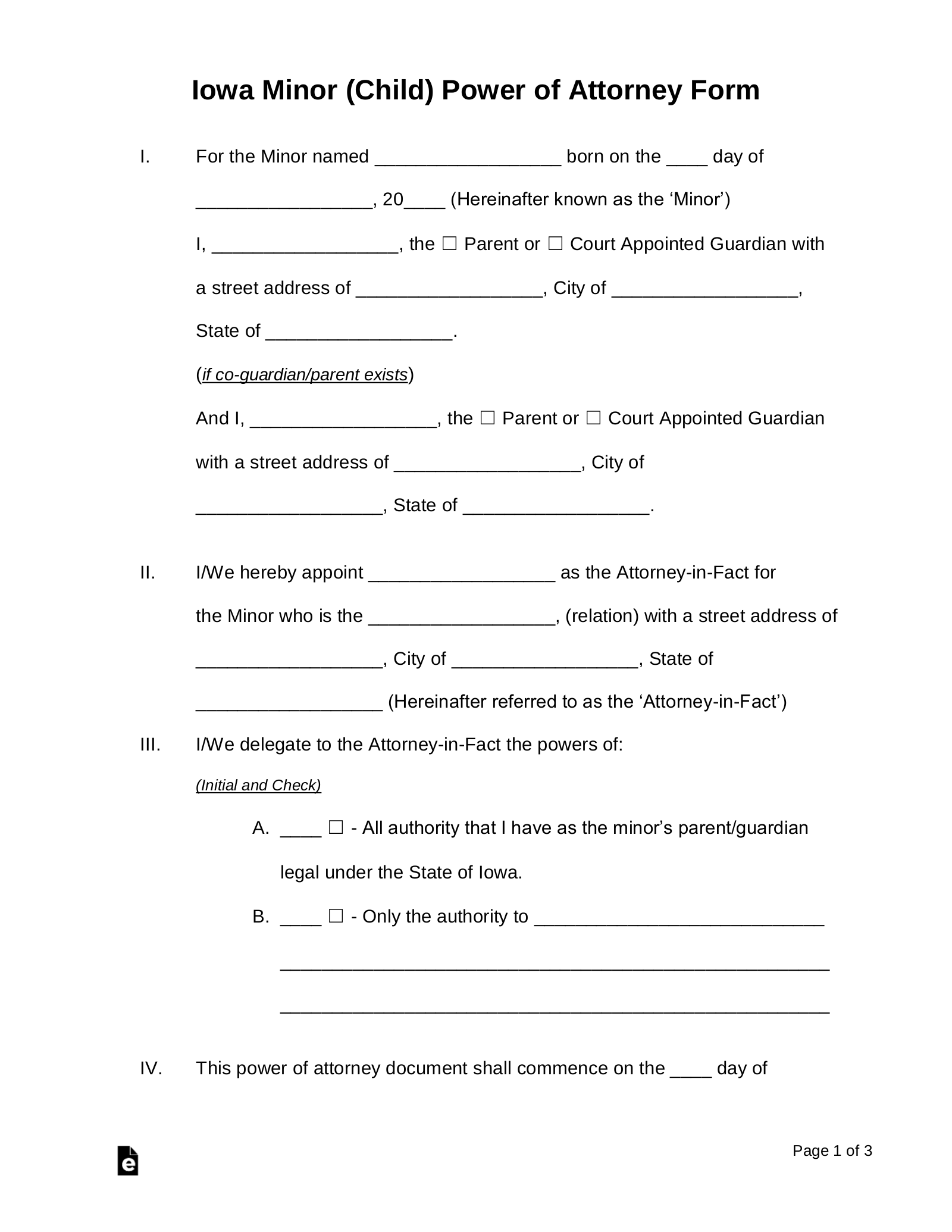 Free Iowa Power Of Attorney For Minor Child Parental Form PDF