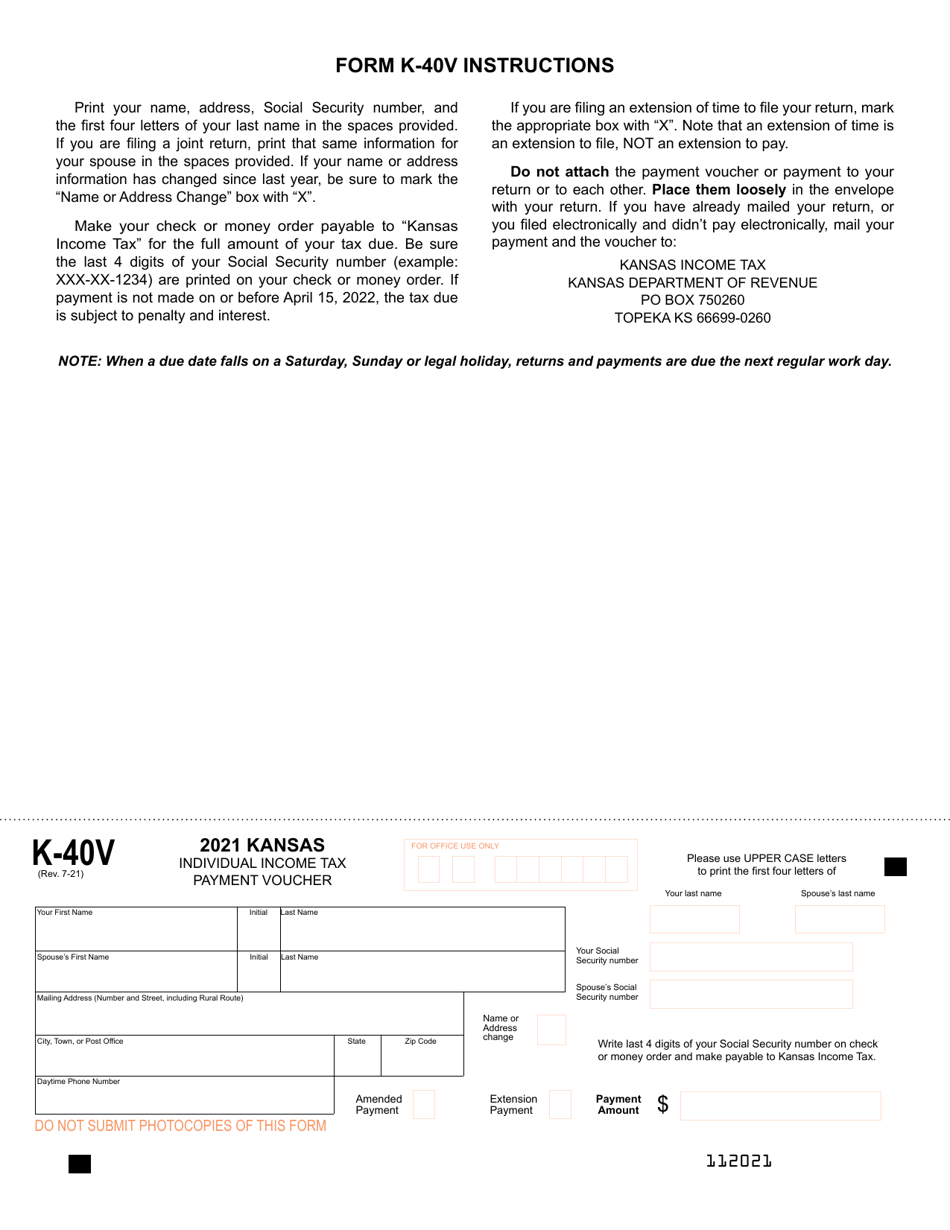Form K 40V Download Fillable PDF Or Fill Online Kansas Individual Income Tax Payment Voucher 2021 Kansas Templateroller