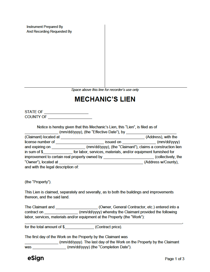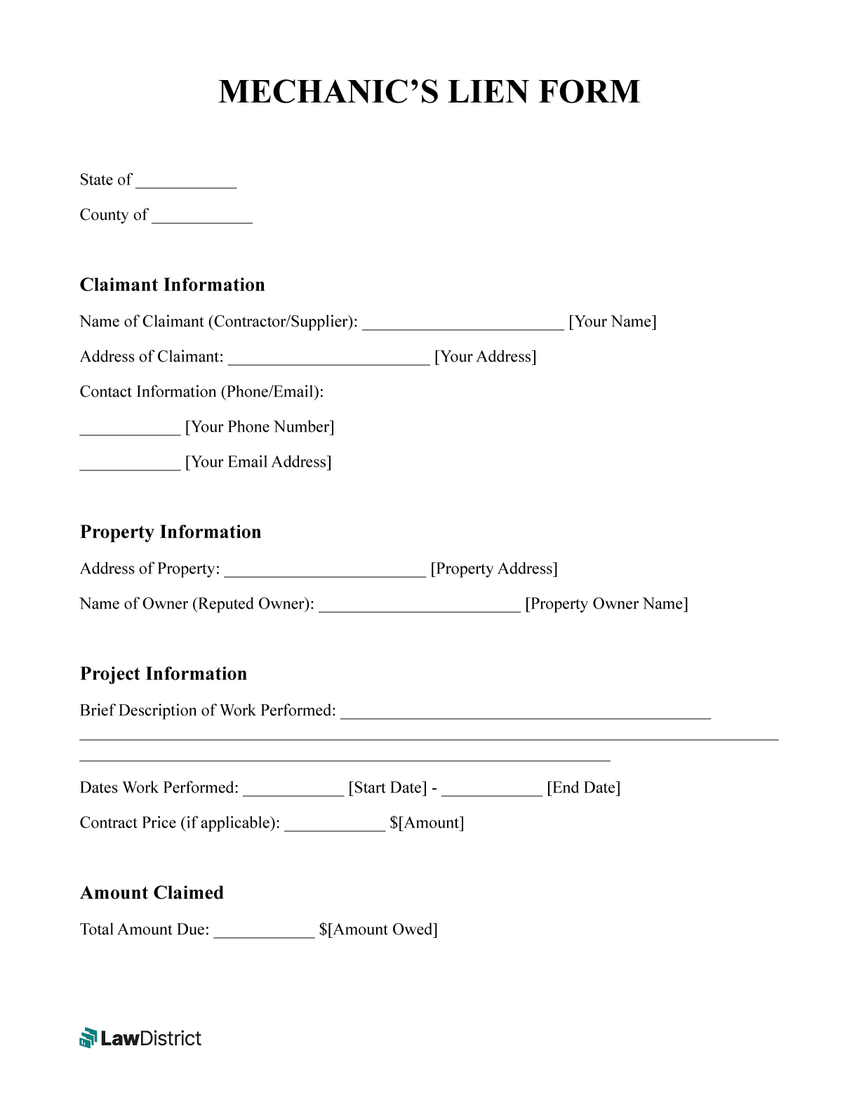 Free Mechanic s Lien Form PDF U0026 Word Template LawDistrict