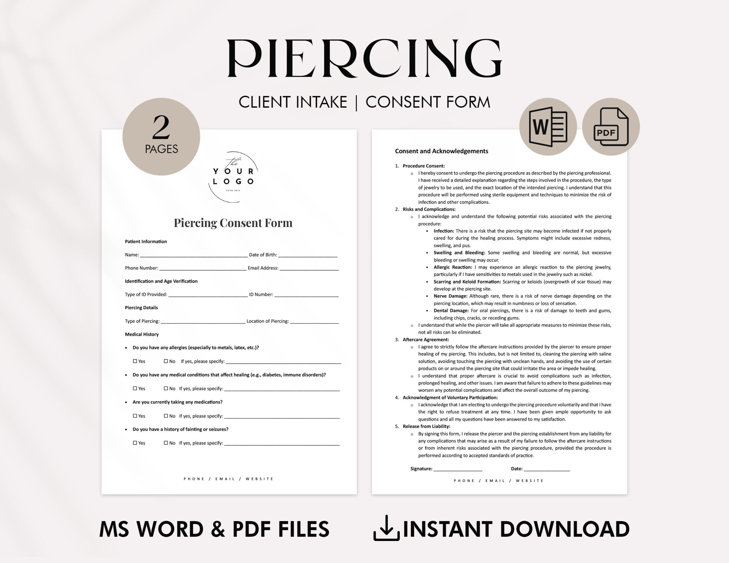 Piercing Consent Form Template Professional Body Piercing Shop Forms Tattoo And Piercing Studio Documents Editable Word U0026 PDF Etsy UK