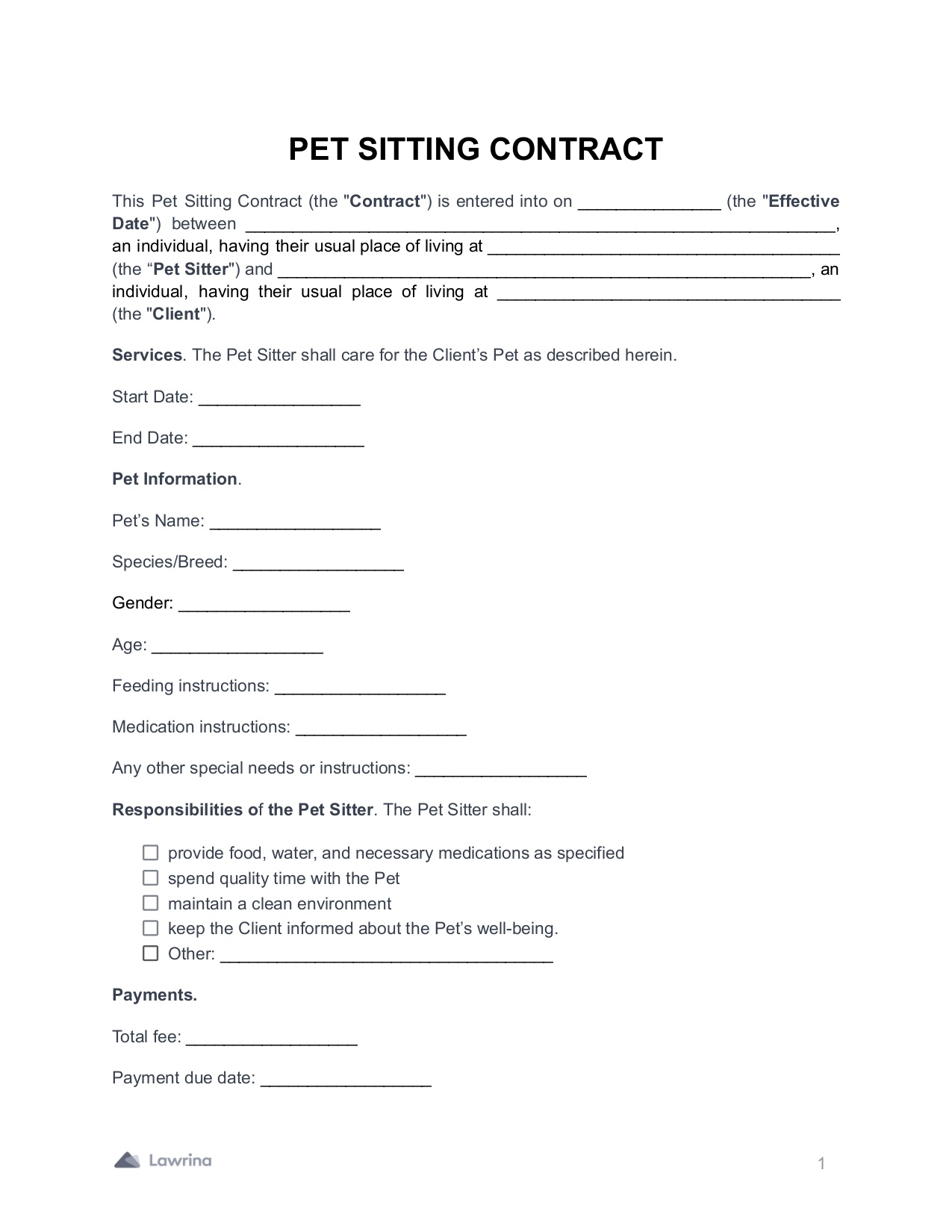 Free Pet Sitting Contract Form Download PDF Lawrina