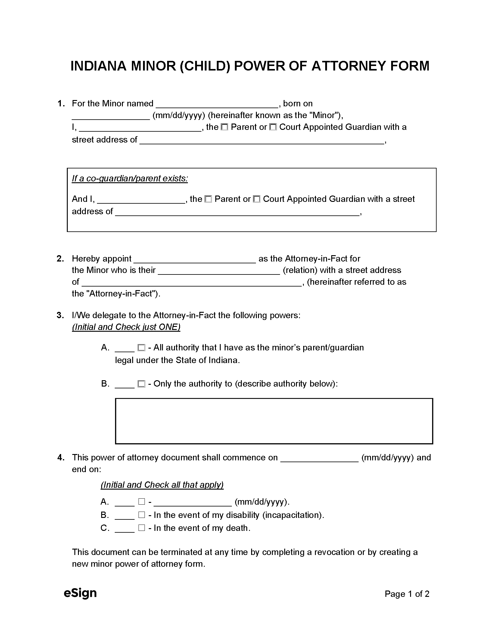 Free Indiana Minor Child Power Of Attorney Form PDF Word