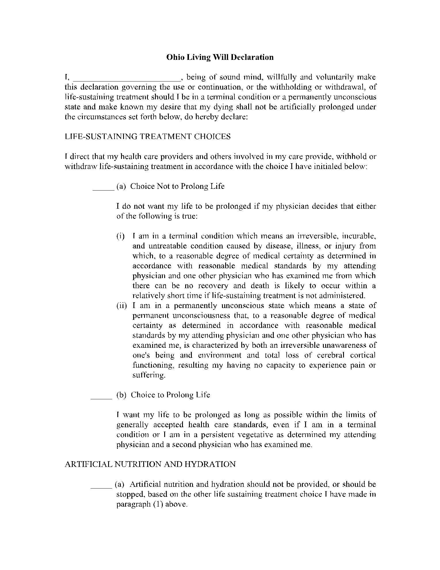 Free Ohio Living Will Form Declaration Template PDF EForms