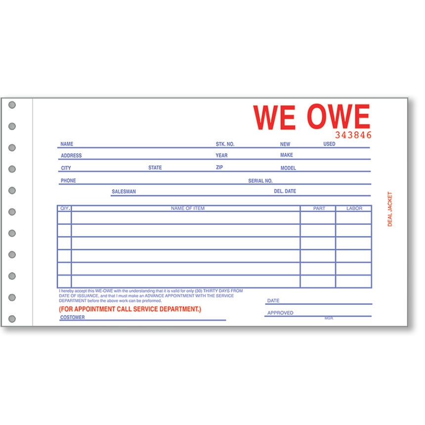 Ru0026R Compatible We Owe Forms Automotive Forms Auto Dealer Supplies
