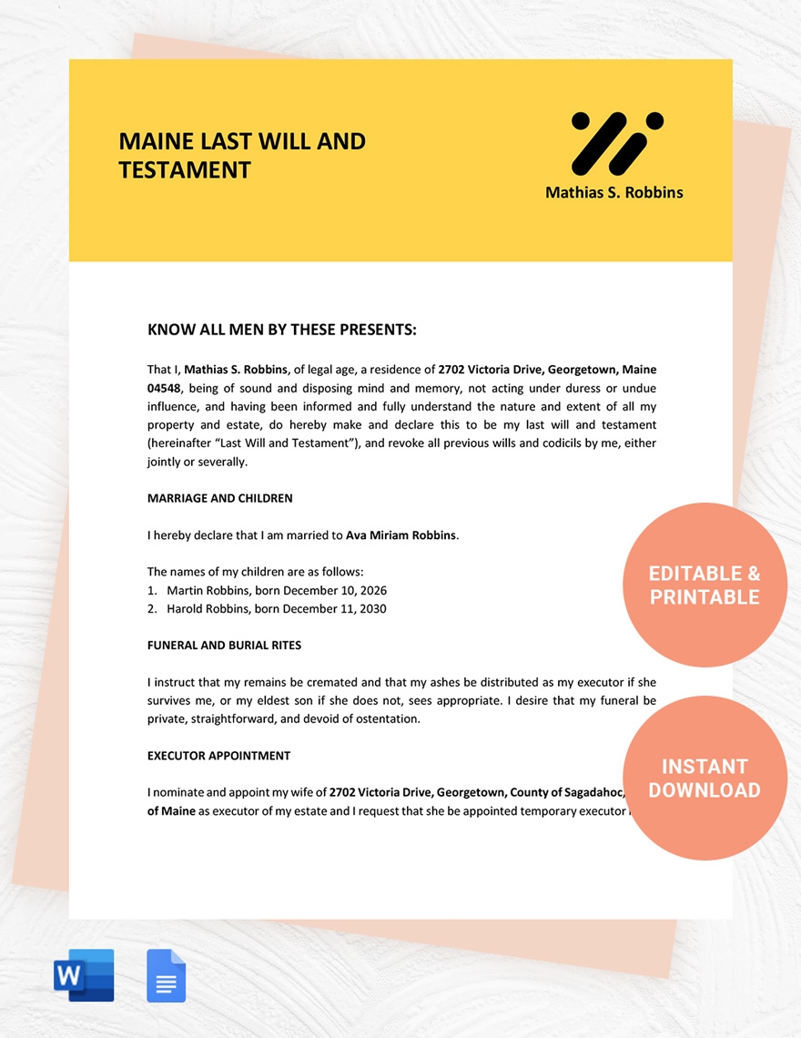 Maine Last Will And Testament Template In Google Docs Word Download Template