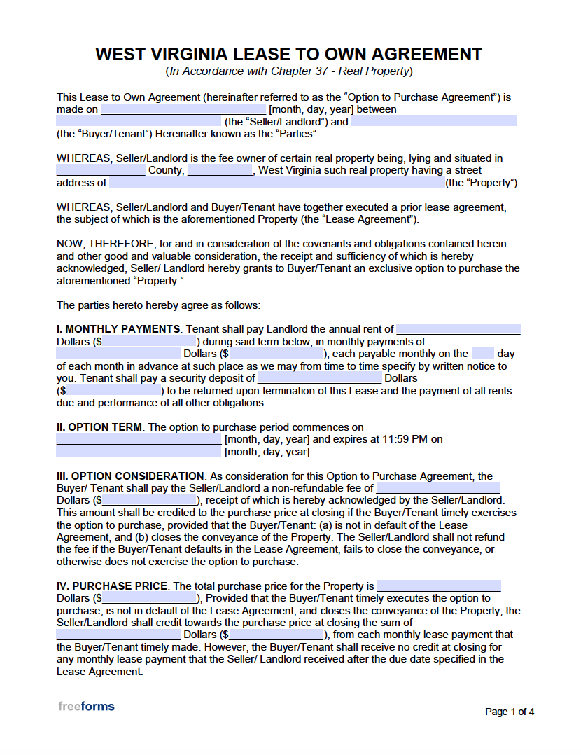Free West Virginia Lease To Own Agreement Form PDF Word