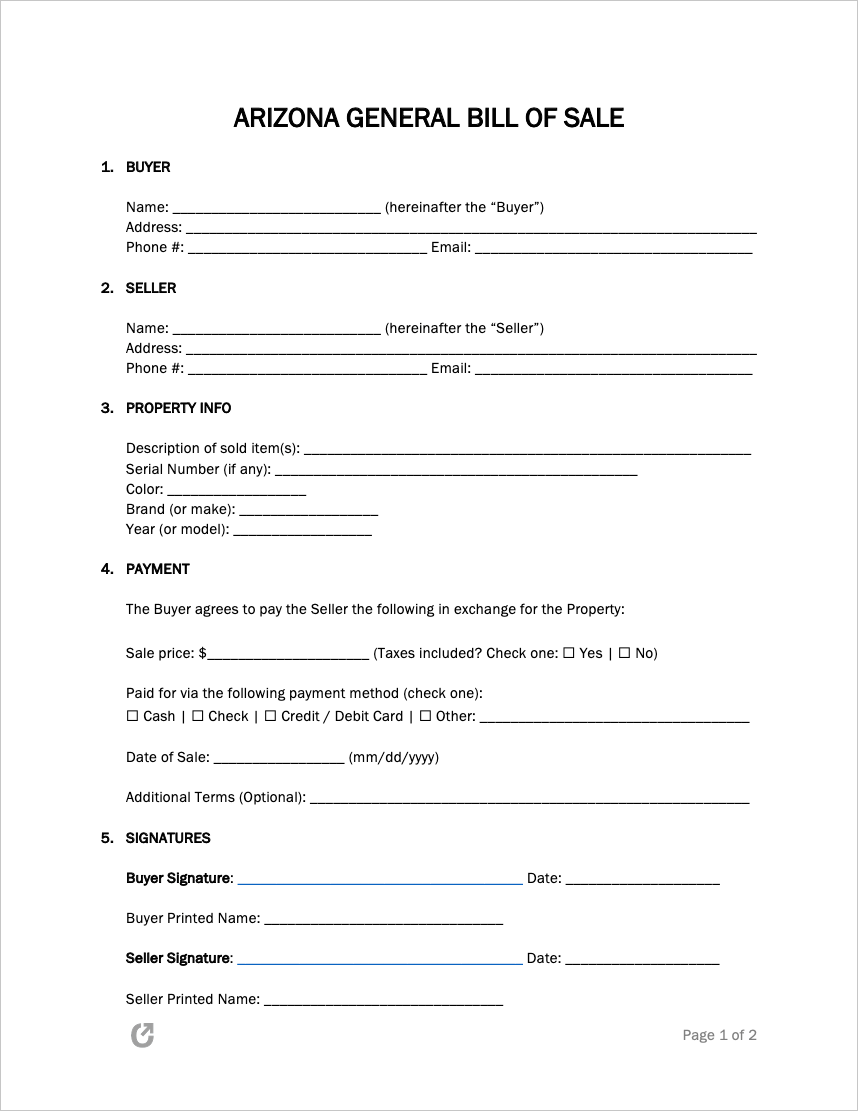 Free Arizona General Bill Of Sale Form PDF WORD RTF