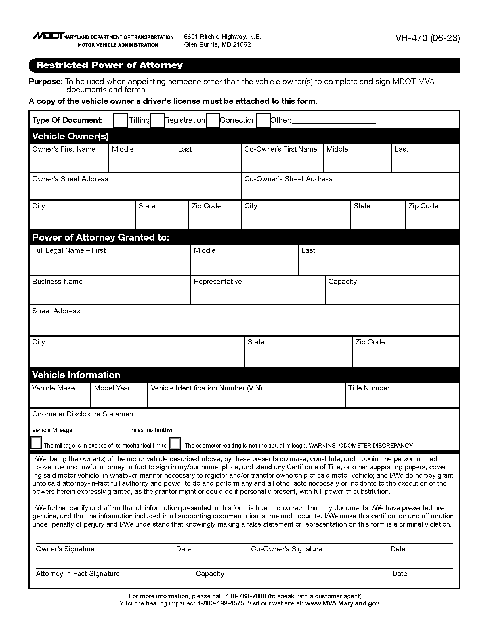 Free Maryland Vehicle Power Of Attorney Form VR 470 PDF EForms