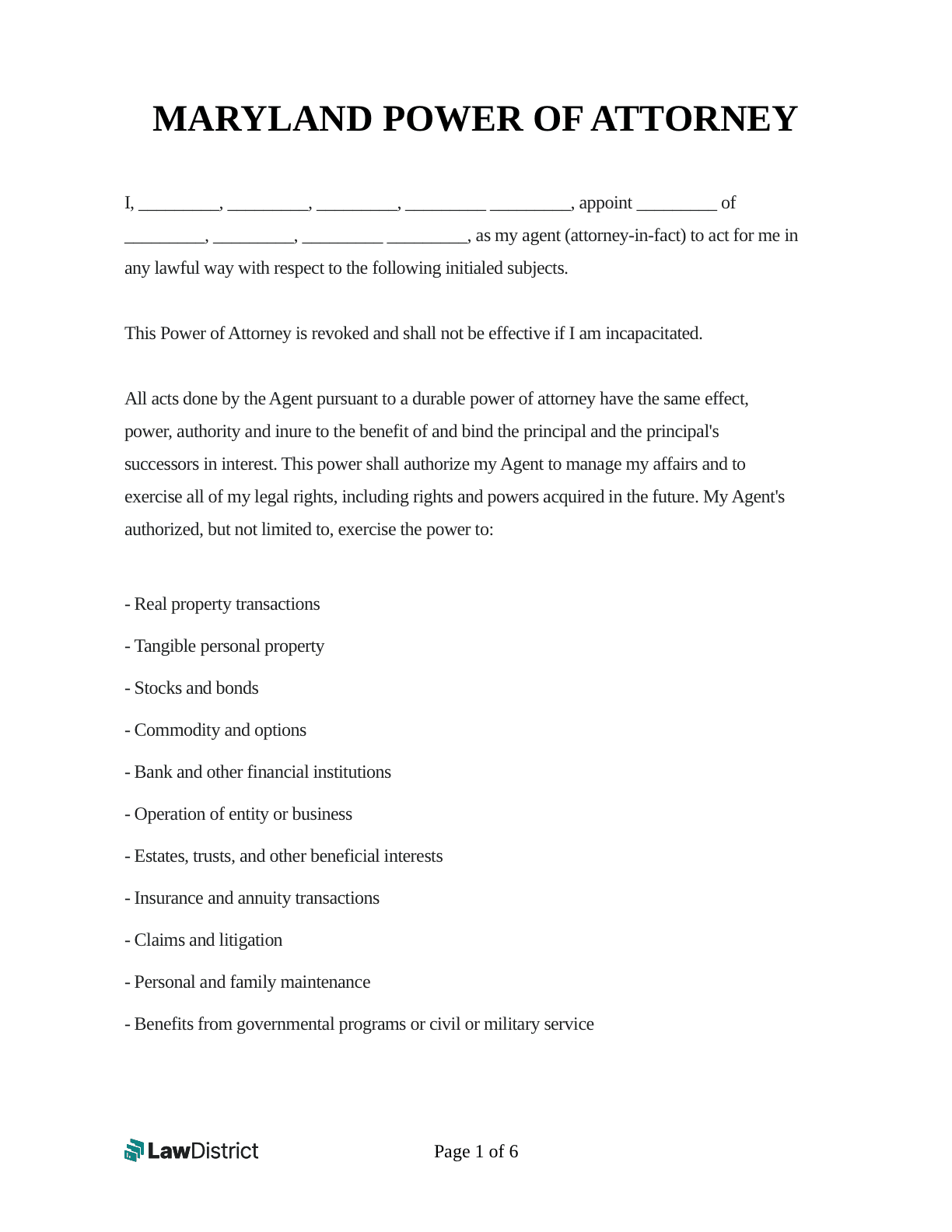 Maryland Power Of Attorney POA Free Form LawDistrict