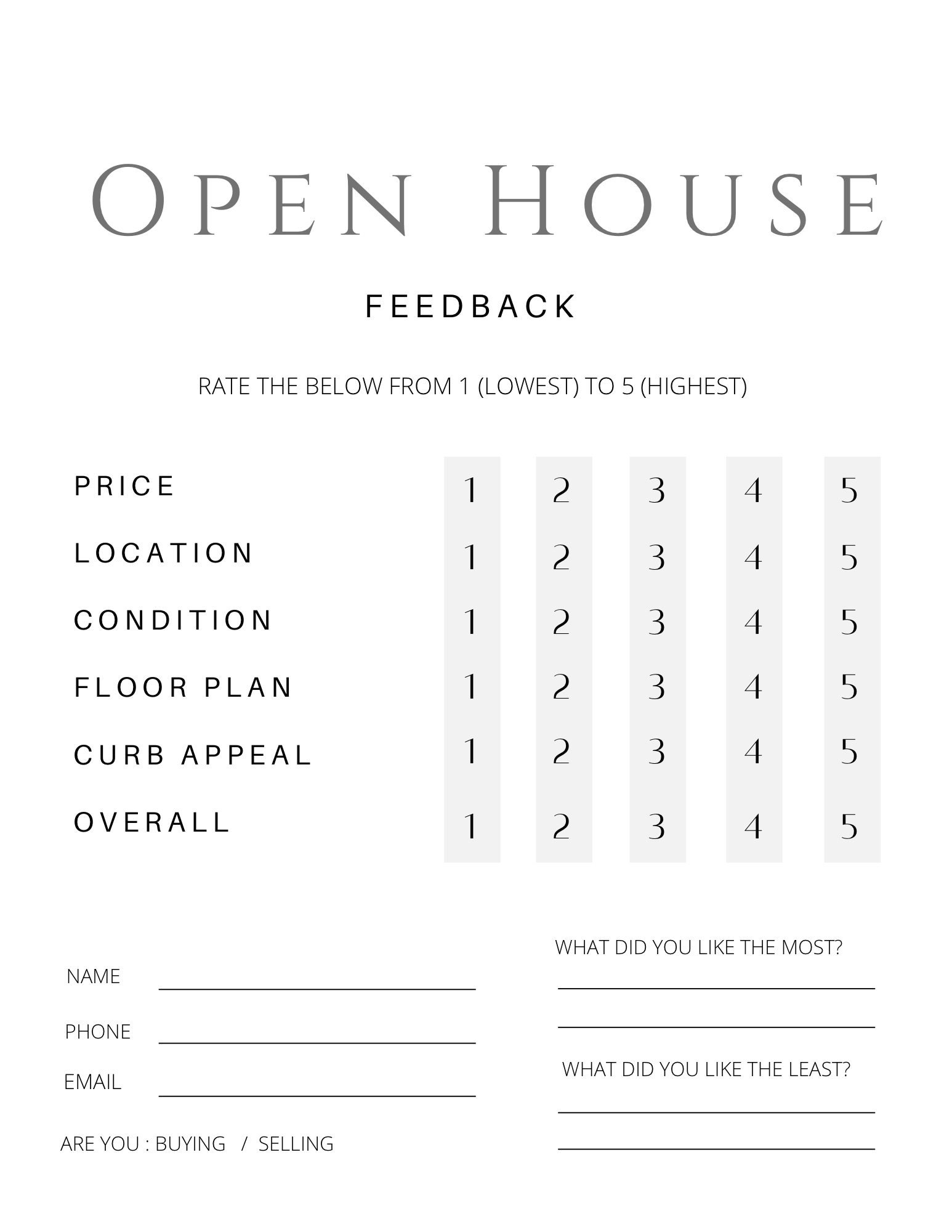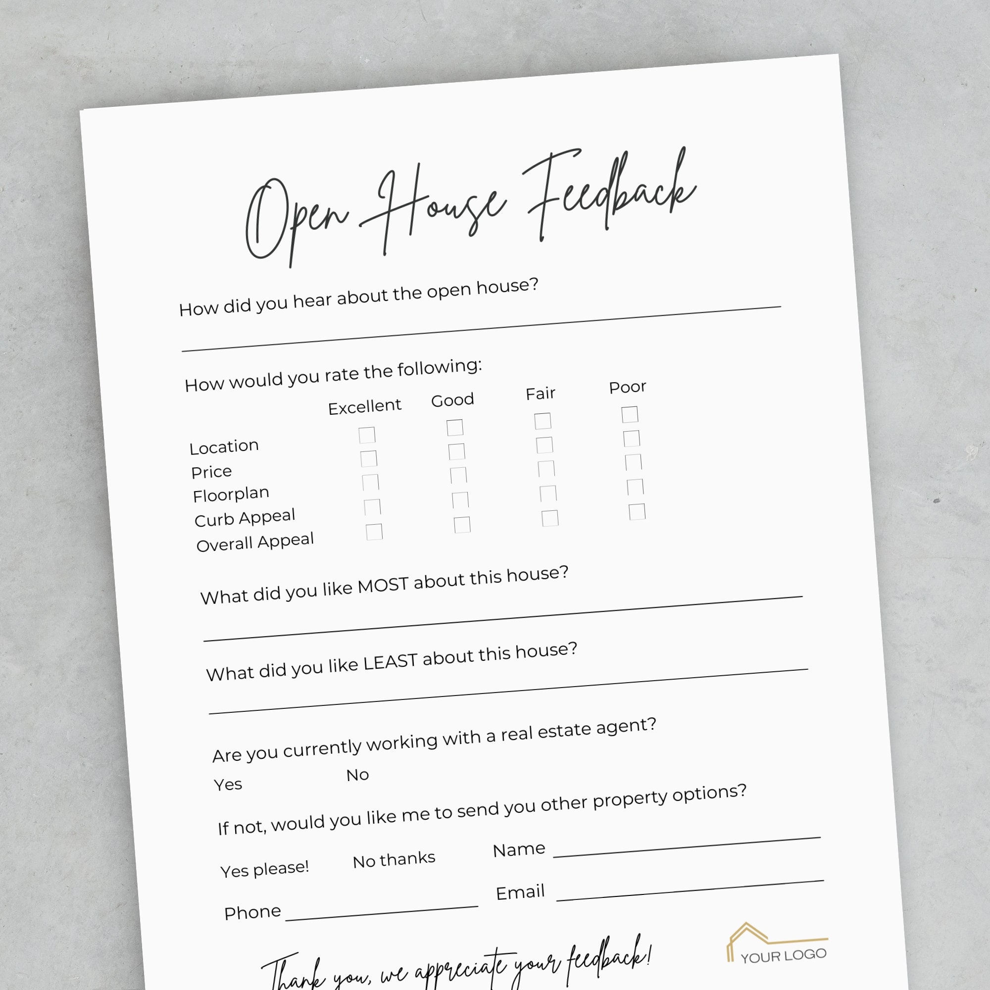 Simply download and print our free feedback form, set it out at your open house event, and let your guests share their thoughts. Collecting feedback is essential for improving future events and ensuring that you provide the best experience for potential buyers.