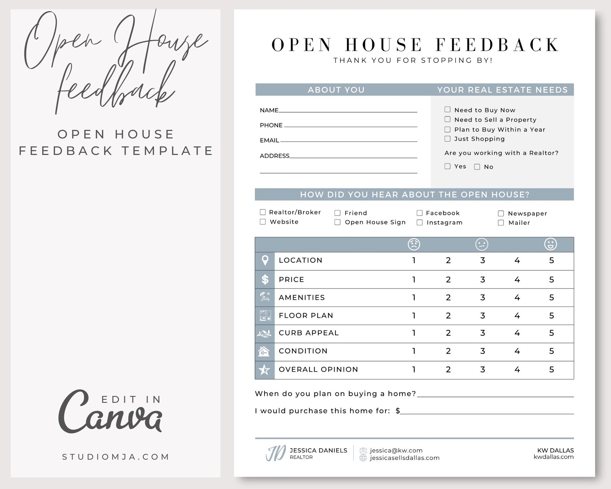 Open House Feedback Form Sheet Template Real Estate Marketing Editable Canva Template Realtor Open House Flyers Etsy