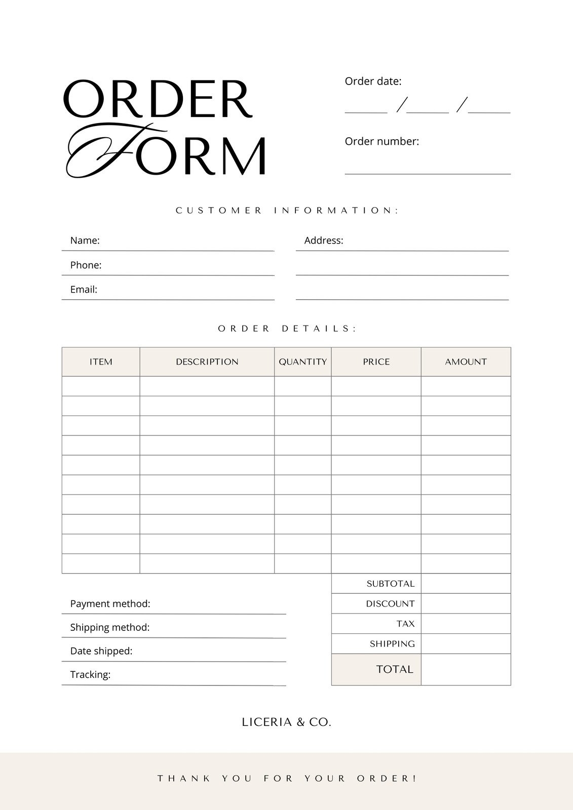 Simply download and print the template, or fill it out digitally, and you’re ready to start taking orders. The template includes sections for customer information, order details, payment options, and more. You can customize it to suit your needs and branding.