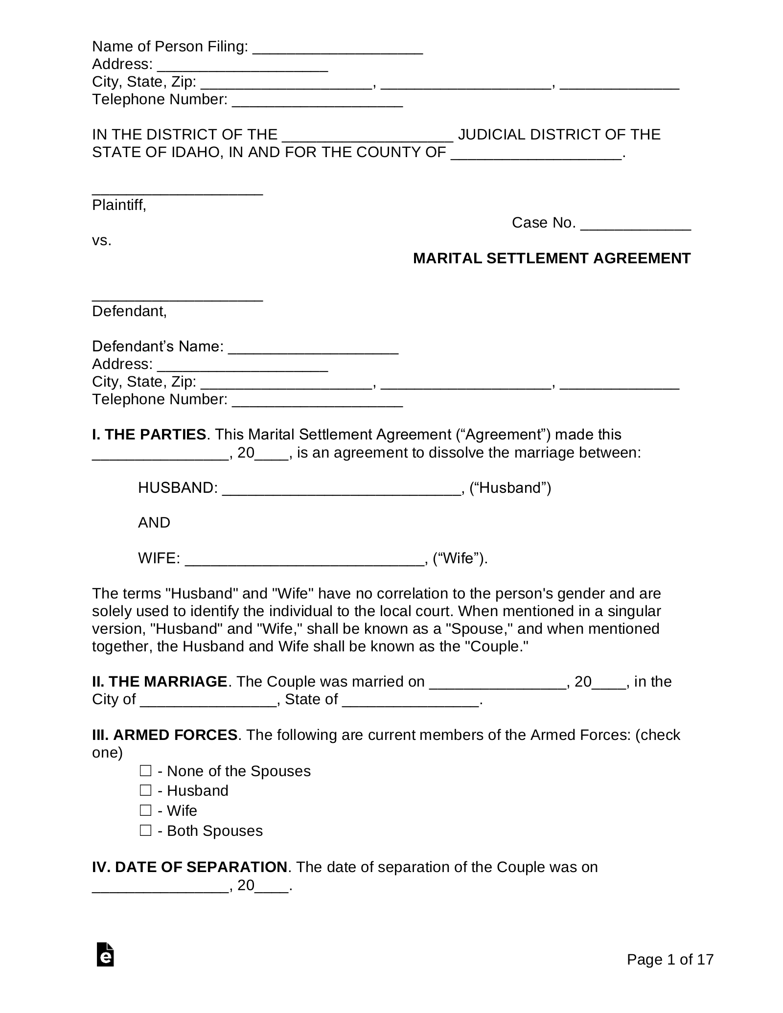 Free Idaho Marital Settlement Divorce Agreement PDF Word EForms