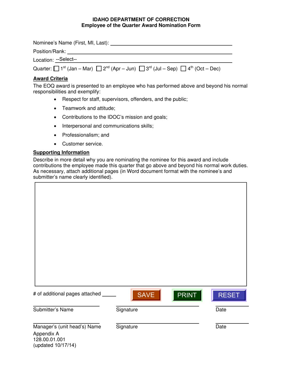 Idaho Employee Of The Quarter Award Nomination Form Fill Out Sign Online And Download PDF Templateroller