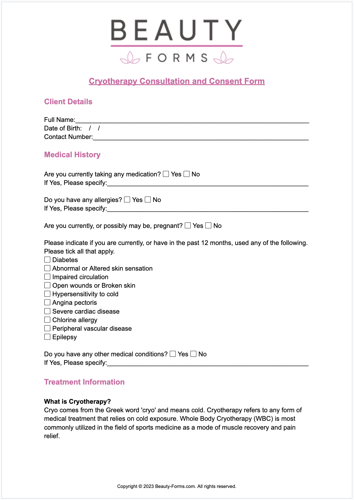 Cryotherapy Consultation Form Online Template Beauty Forms