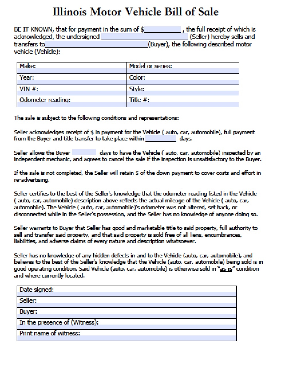 Printable Illinois Motor Vehicle Bill Of Sale Form Free
